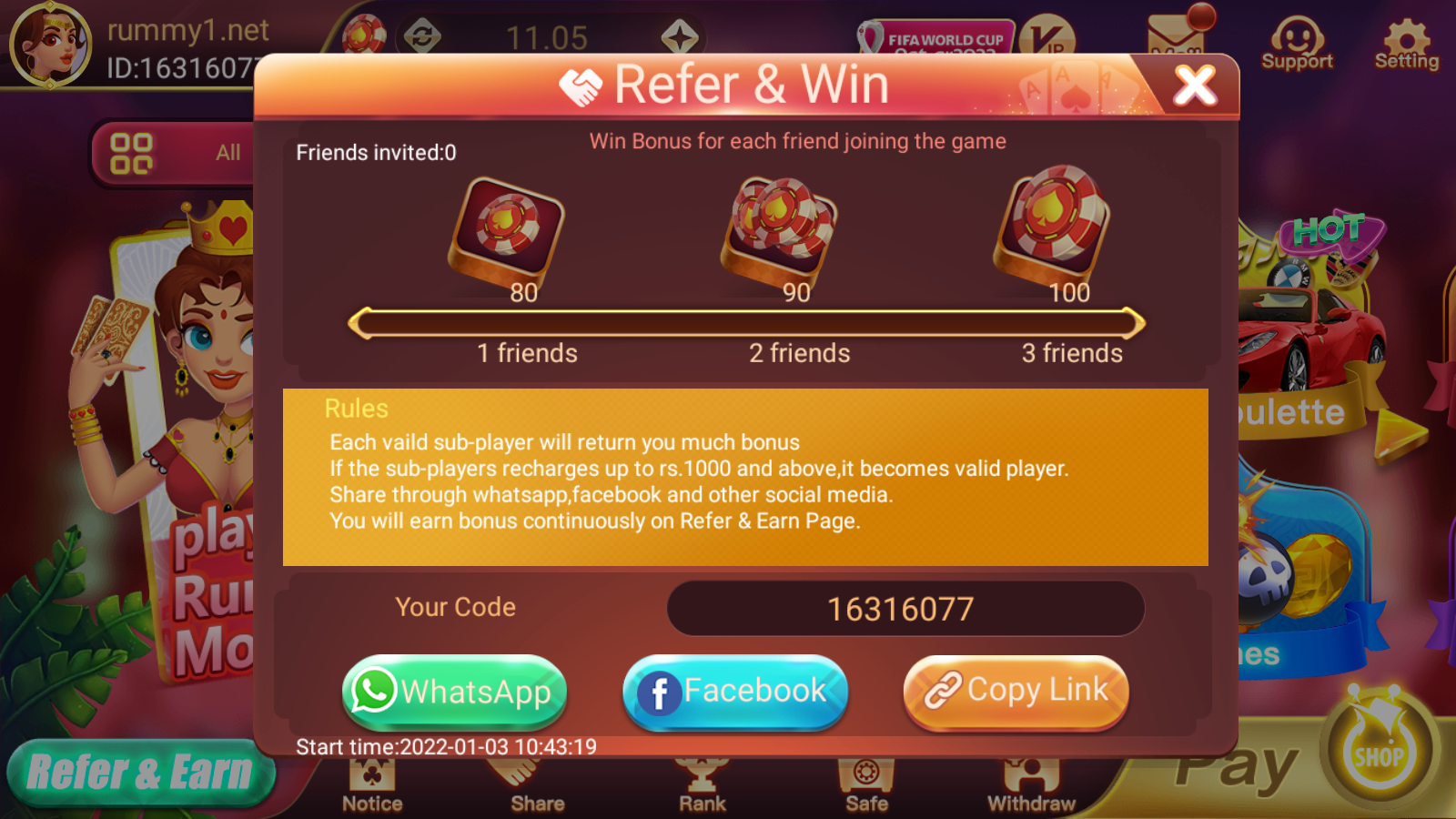Successfully invite N friends to Get: N*100Rs